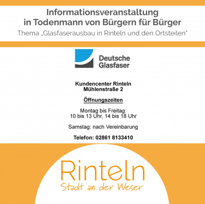 Am Freitag, dem 08. April 2022, findet ab 15:00 bis ca. 19:00 Uhr eine Infoveranstaltung in Todenmann von Bürgern für Bürger rund um das Thema „Glasfaserausbau in Rinteln und den Ortsteilen“ statt.