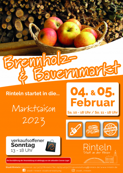 Die Stadt Rinteln läutet die Marktsaison 2023 mit dem „Brennholz- und Bauernmarkt“ vom 04. bis 05. Februar ein.