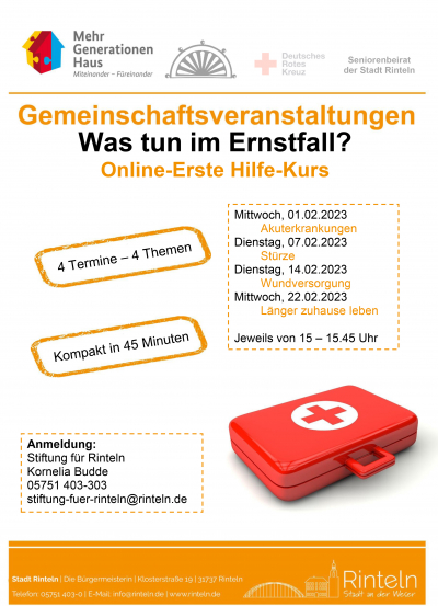 Online-Erste Hilfe-Kurse des DRK Das Mehrgenerationenhaus, die Stiftung der Stadt Rinteln sowie der Seniorenbeirat der Stadt Rinteln laden zum kostenlosen Online-Erste-Hilfe-Kurs ein.