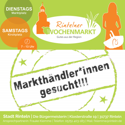 Zur Erweiterung und Sicherung der Angebotsvielfalt auf den Rintelner Wochenmärkten sucht die Stadt Rinteln Händler*innen, die ihre regionalen Produkte und eigenen Erzeugnisse des täglichen Bedarfs an den Markttagen anbieten möchten. Insbesondere Bewerbungen in den Sortimentsbereichen Käse, Wildspezialitäten, Fisch und „Unverpackt-Waren“ sind wünschenswert, aber auch andere Angebote wie z.B. Verzehrstände sind willkommen.