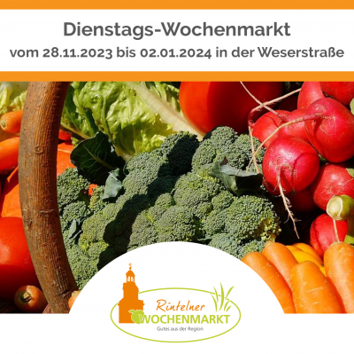 Aufgrund der Durchführung des „Rintelner Adventszaubers“ wird der Dienstags-Wochenmarkt vom 28. November 2023 bis 02. Januar 2024 in der Weserstraße stattfinden.