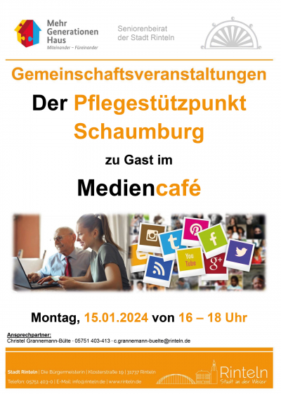 Beim nächsten Mediencafé am Montag, den 15.01.2024, beantwortet Frau Schauß vom Pflegestützpunkt des Landkreises Schaumburg Fragen rund um das Thema Pflege.