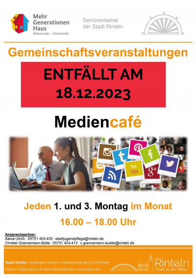 Das „Mediencafé“ im Mehrgenerationenhaus findet am Montag, den 18.12. nicht statt.