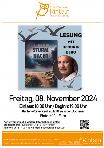 Am Freitag, den 8. November um 19 Uhr wird der bekannte Autor Hendrik Berg seinen Kriminalroman „Sturmnacht“ in der Stadtbücherei Rinteln vorstellen.