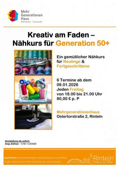 Kreativität kennt kein Alter: Ab dem 09.01.2026 lädt Generation 50+ herzlich zu einem Nähkurs in angenehmer und ruhiger Atmosphäre ein.