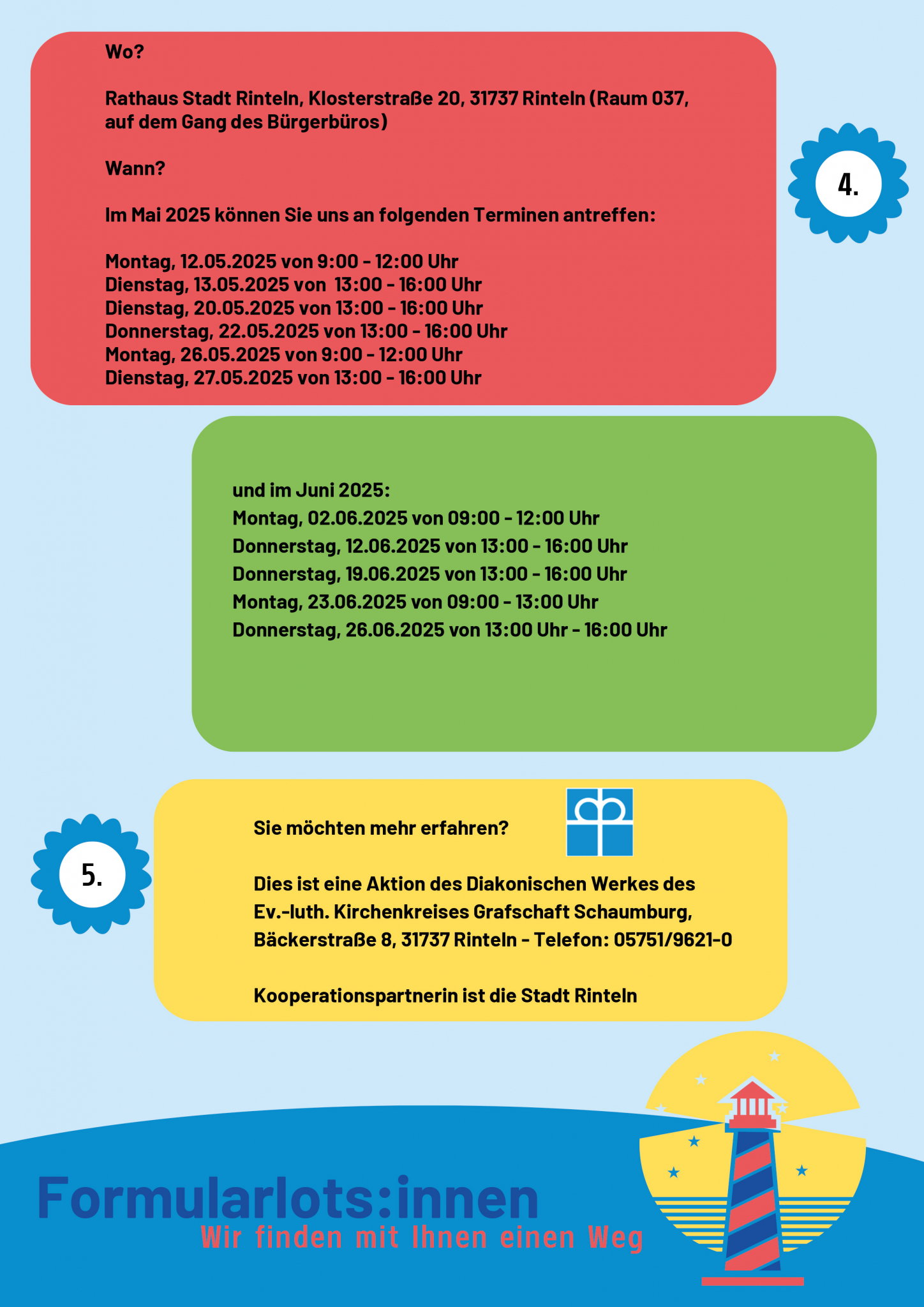 Die Formularlotsen findet man zur Unterstützung im Rathausgebäude, Klosterstr. 20, im Erdgeschoß in Raum 37. Termine werden sowohl auf der Internetseite der Stadt Rinteln als auch auf der Seite des Diakonischen Werkes Rinteln zwei Monate im Voraus veröffentlicht. Darüber hinaus können Termine auch telefonisch unter der Telefonnummer 05751 - 96210 vereinbart werden.